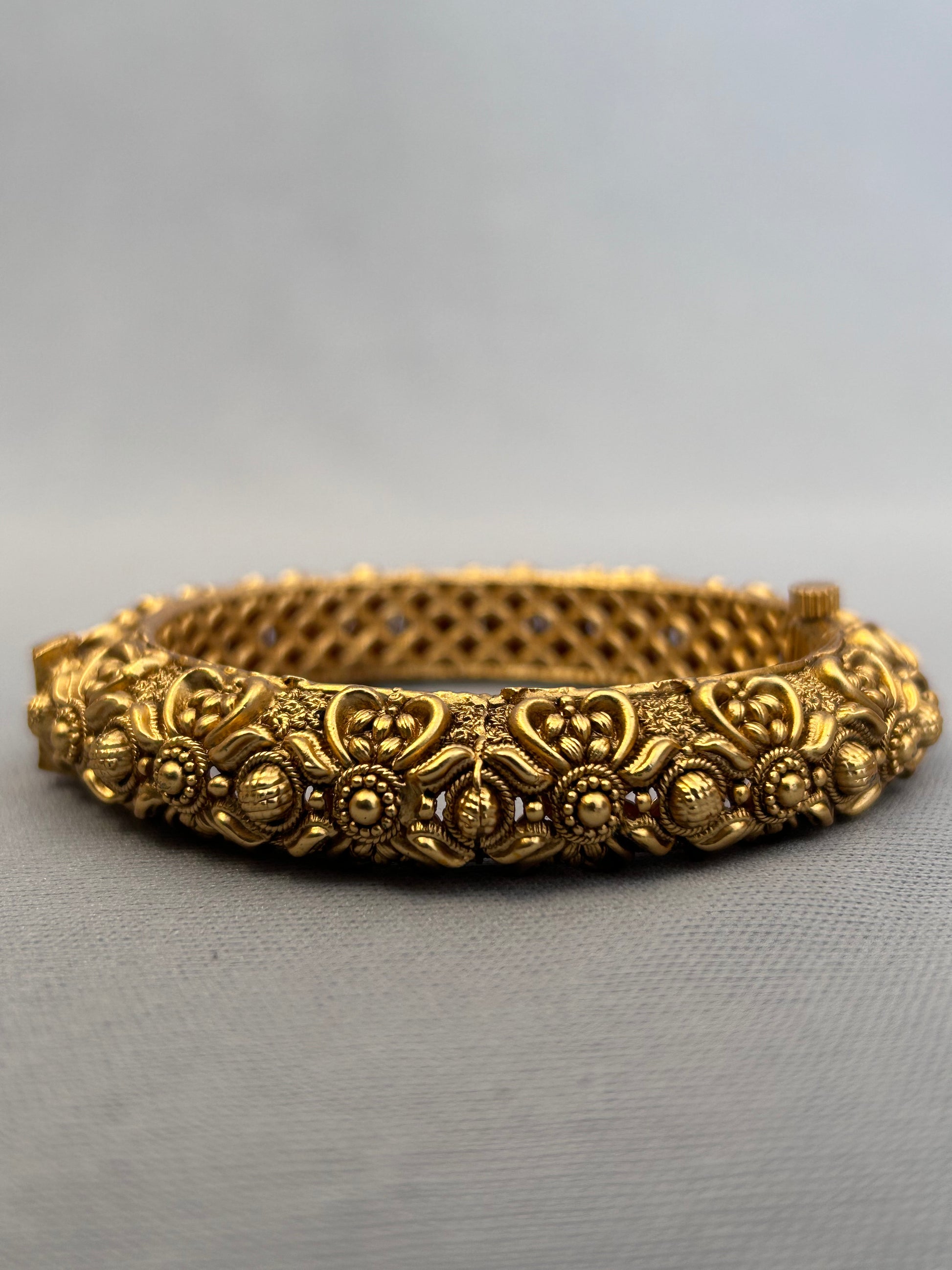 "Add a touch of tribal art to your jewelry collection with these Antique Gold Bangles! Hand-crafted with intricate designs, these bangles are perfect for both casual and formal occasions. A unique addition to any outfit, these bangles are sure to make a statement!"