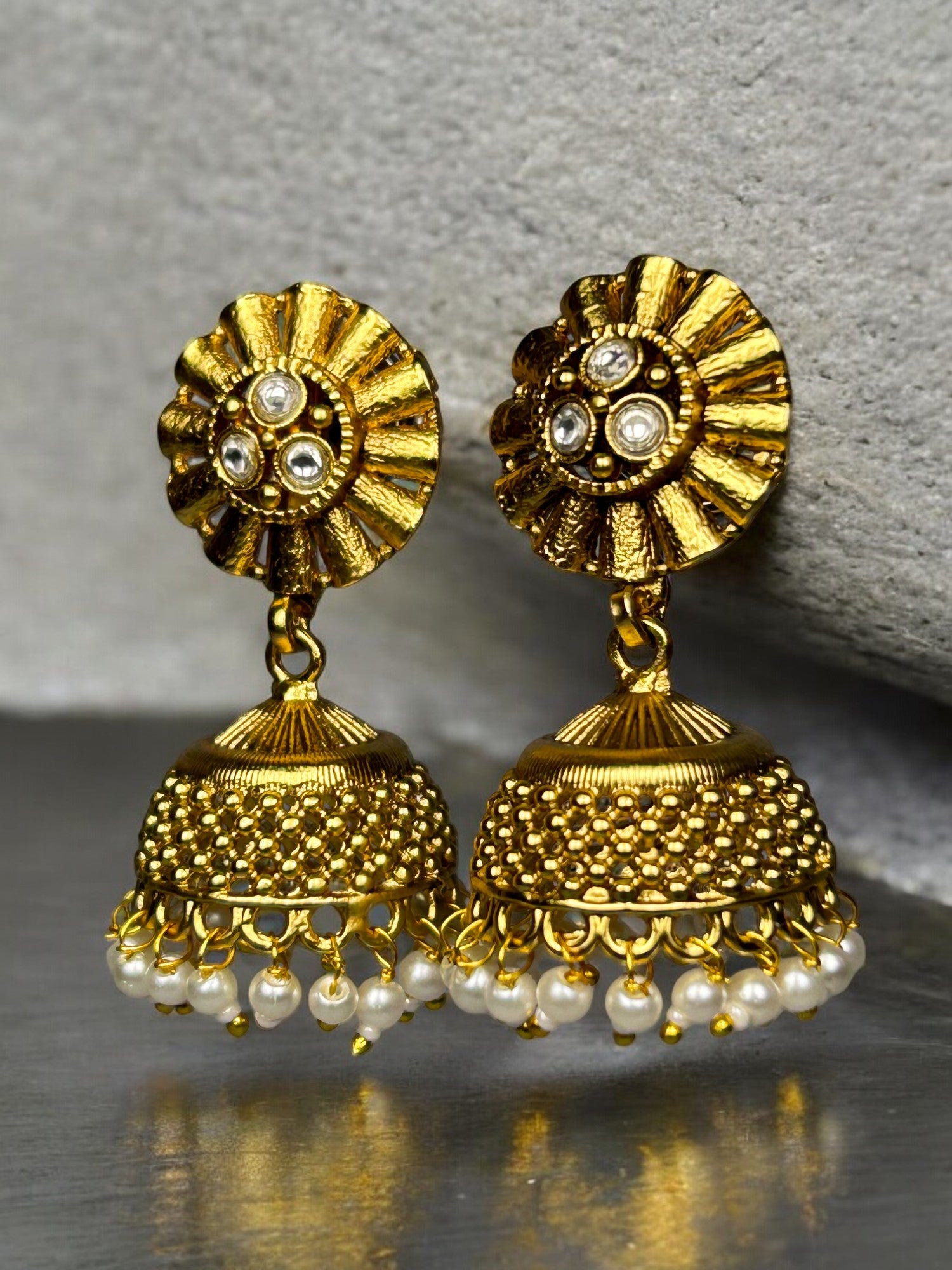 Gold Jhumkas with AD and Pearl Beads
