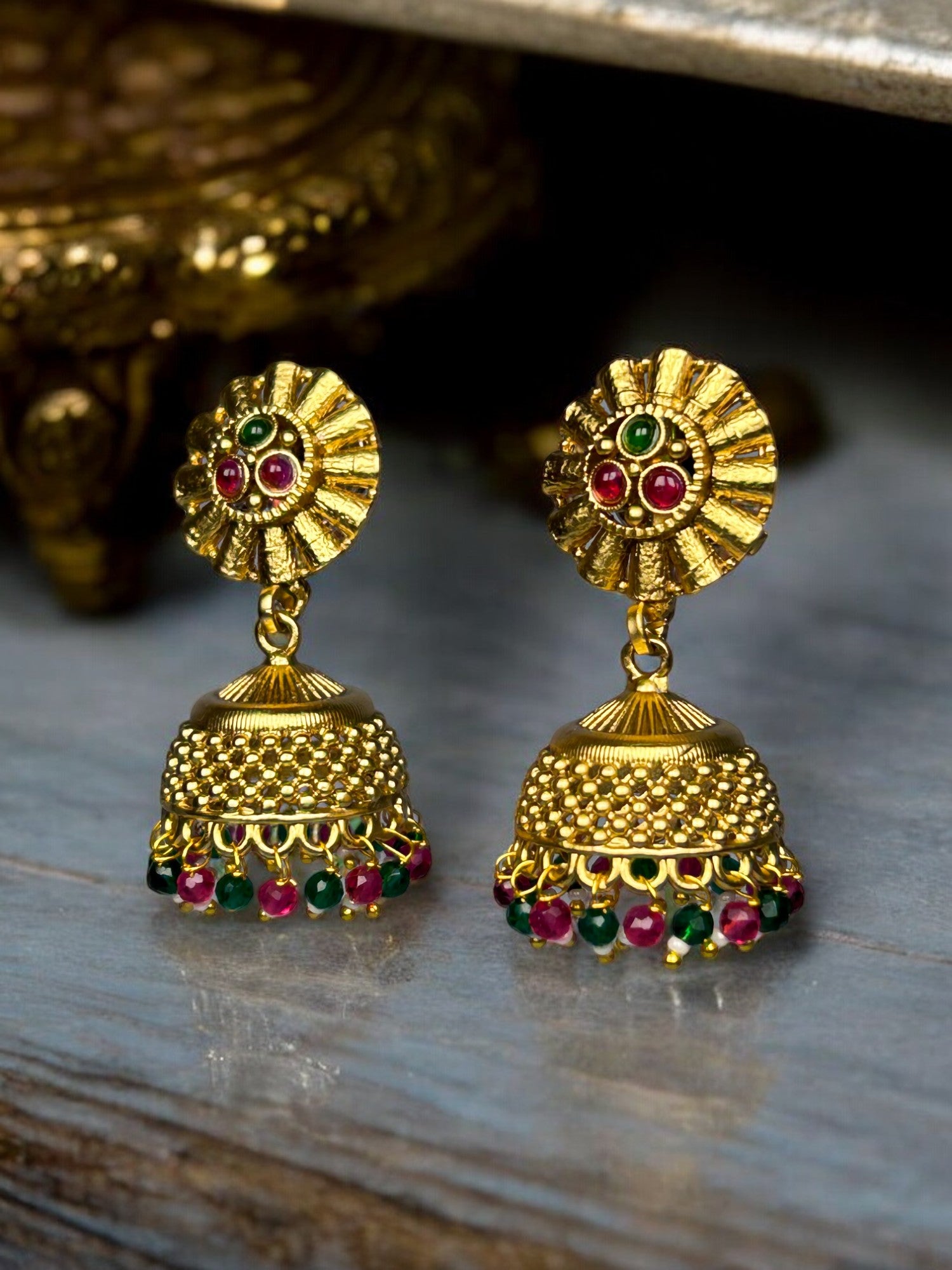 Add a splash of colour to your outfit with our Gold Jhumkis adorned with vibrant stones. These playful earrings will add a touch of whimsy and charm to any look. A must-have accessory for any fashion-forward individual.