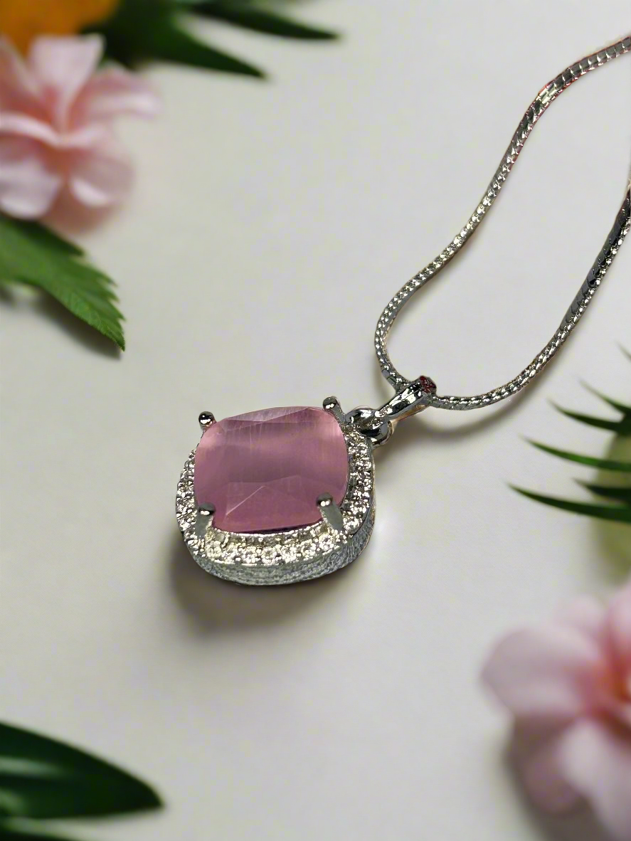 Add a touch of pink to your look with our Pink Quartz and AD Pendant Set, complete with matching earrings and ring. This playful set is perfect for adding a pop of colour to any outfit. (Bonus: it's also a great conversation starter!)