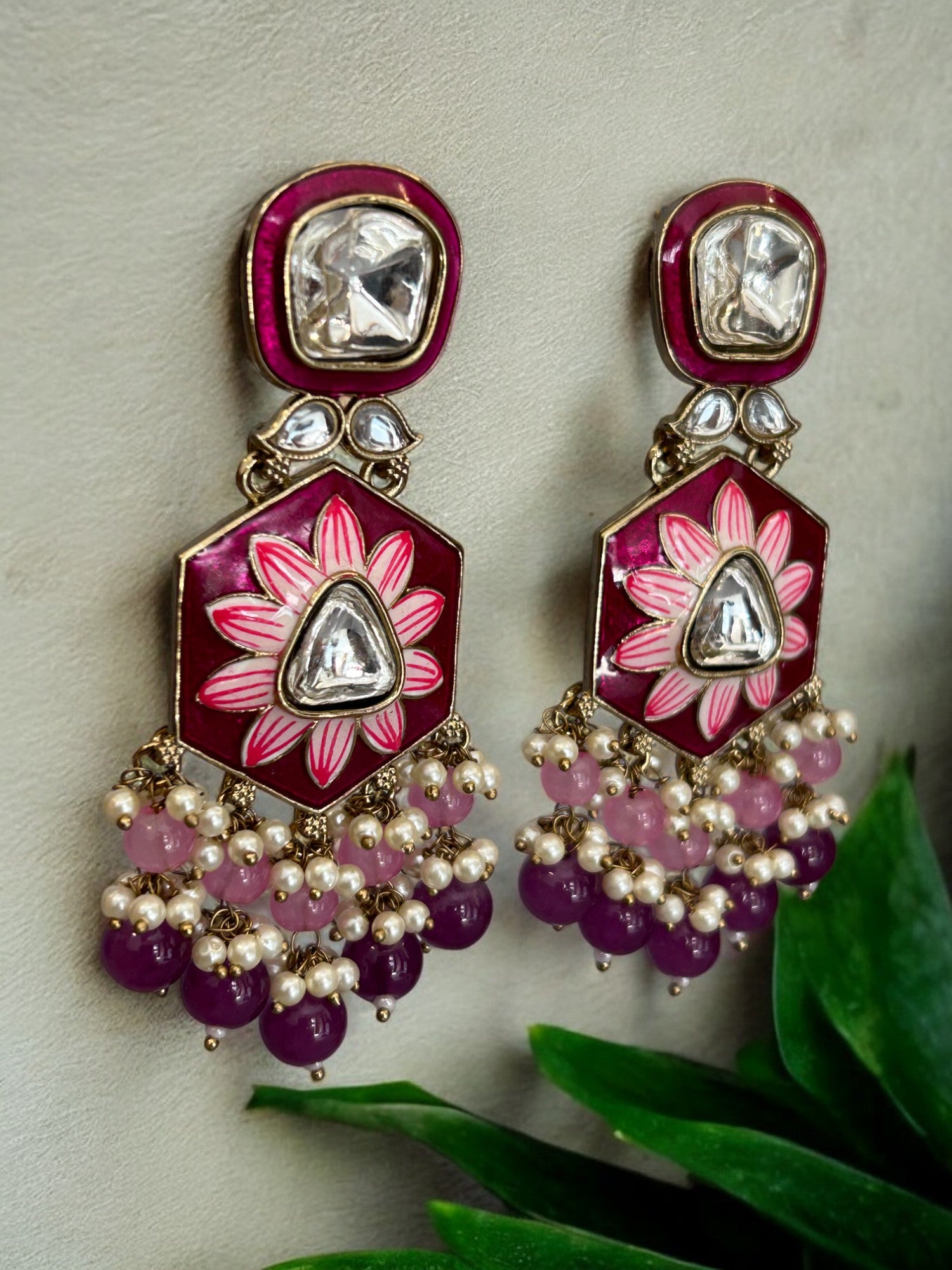 Add some color and sparkle to your outfit with these vibrant Purple Minakari and Polki Dangler Earrings! Designed with playful purple enamel and shimmering polki stones, these earrings are the perfect accessory for any occasion. Elevate your style and let your personality shine!