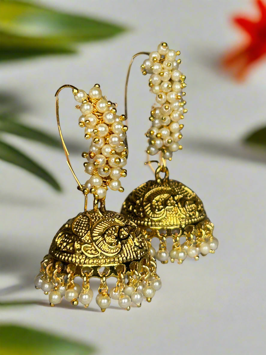Bring a playful charm to your ensemble with the Lavanya Gold Plated Jhumki Earrings, featuring delicate pearl beads. These earrings blend traditional elegance with a fun, lively vibe, making them perfect for adding a twinkle to your celebrations or everyday style. Light and graceful, they’re sure to keep you smiling all day long.