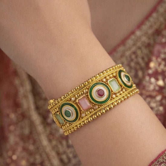 Slip into elegance with the Riti Gold Plated Bangle—where timeless charm meets modern sparkle. This radiant piece catches the light beautifully, adding a touch of golden glamour to any occasion. Whether you're dressing up for celebrations or elevating your everyday style, the Riti bangle is your go-to accessory for that perfect shimmer. Lightweight, comfortable, and endlessly versatile, it's the kind of piece that makes you smile every time you catch your reflection.